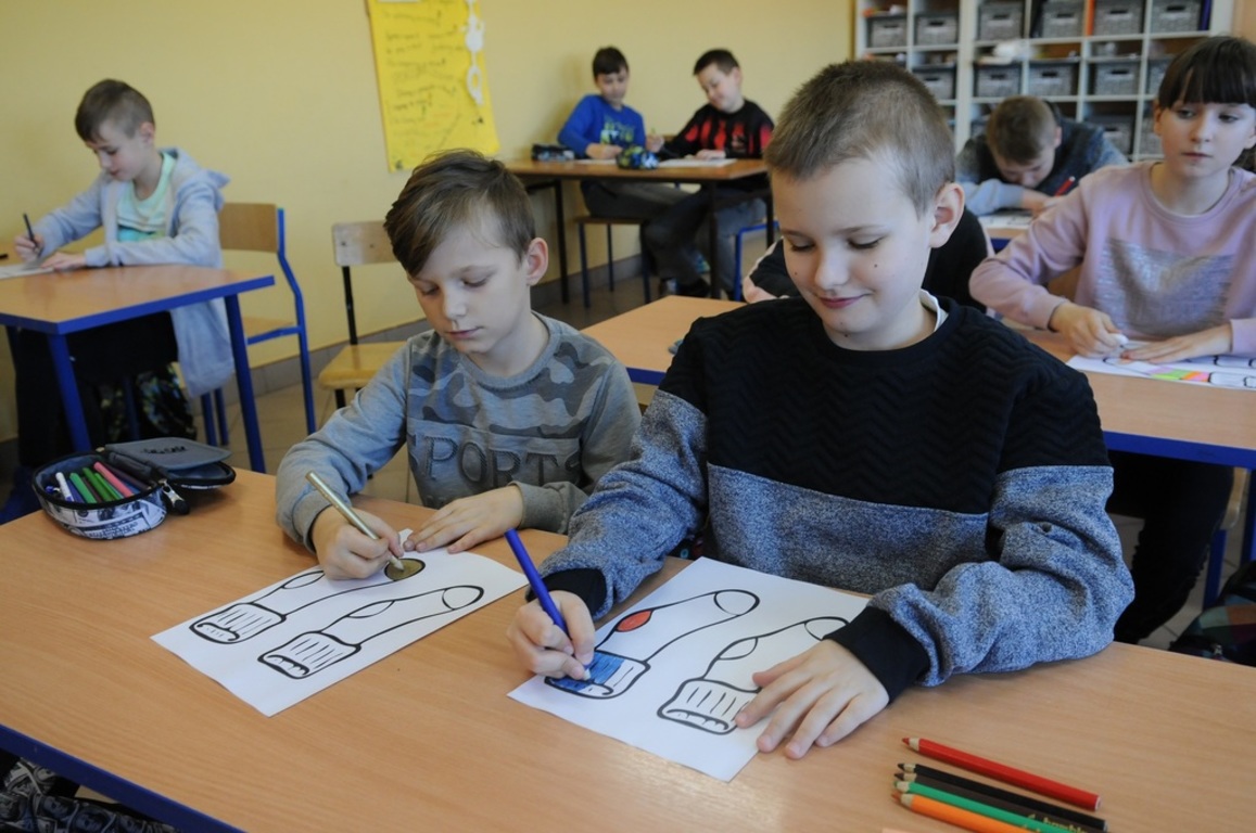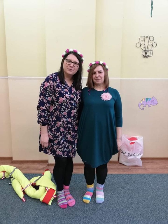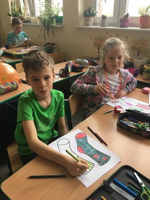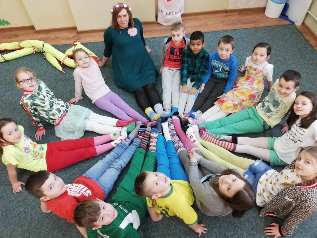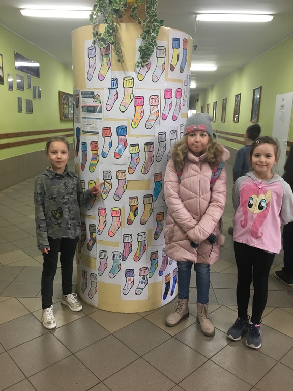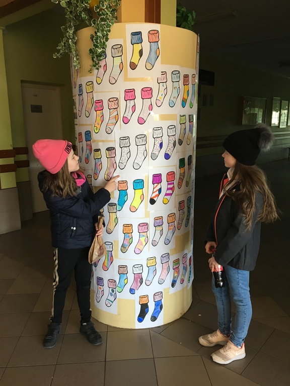 Już 20 marca logopeda I. Stanisławska oraz I. Styburska przeprowadziły warsztaty w klasach czwartych na temat poszanowania, akceptacji i promowania praw osób z Zespołem Downa. Dzieci odpowiadały na pytania problemowe: Czym się różnimy? Co nas łączy? Co oznacza wykluczenie i jak czuje się osoba wykluczona? Dlaczego boimy się nieznanego? Z jakimi ludźmi chcemy spędzać czas? Doszliśmy do wniosków, że każdy z nas jest inny a jednocześnie jesteśmy do siebie podobni, nikt nie lubi być „wykluczony”, chcemy otaczać się dobrymi ludźmi, a osoby z Zespołem Downa to właśnie dobrzy ludzie. Jako gest solidarności uczniowie zaprojektowali wzorzyste, oryginalne skarpety w formie prac plastycznych. Prace dzieci zostały wyeksponowane na szkolnych korytarzach. Aby zwiększyć świadomość społeczności szkolnej na temat osób z Zespołem Downa w holu szkolnym oraz przy gabinecie logopedycznym uczniowie przygotowali gazetki tematyczne a nauczyciele prowadzili w klasach pogadanki. 21 marca dzieci i pedagodzy założyli dwie różne skarpetki jako symbol identyfikowania się z osobami z Zespołem Downa. Ponadto dzieci wzięły udział w konkursie fotograficznym i wykonały w klasach, grupach rówieśniczych oraz rodzinach zdjęcia z różnymi skarpetkami. Już wkrótce podsumowanie konkursu. Dziękujemy za zaangażowanie w akcję.