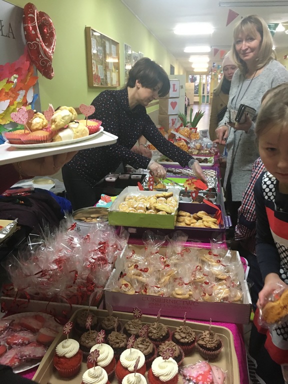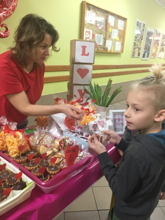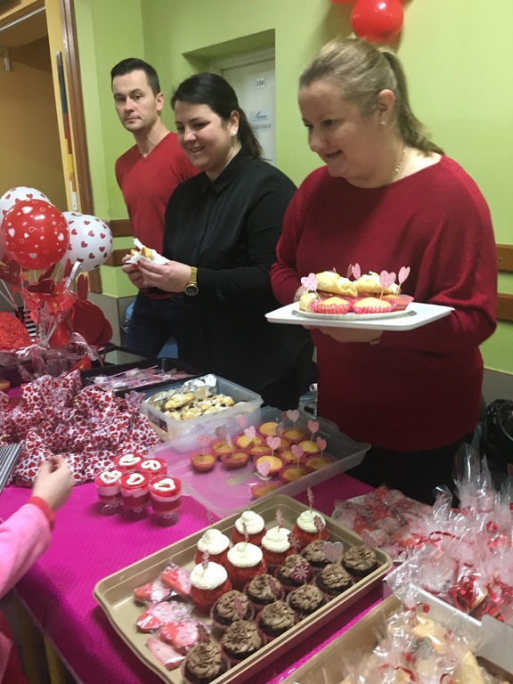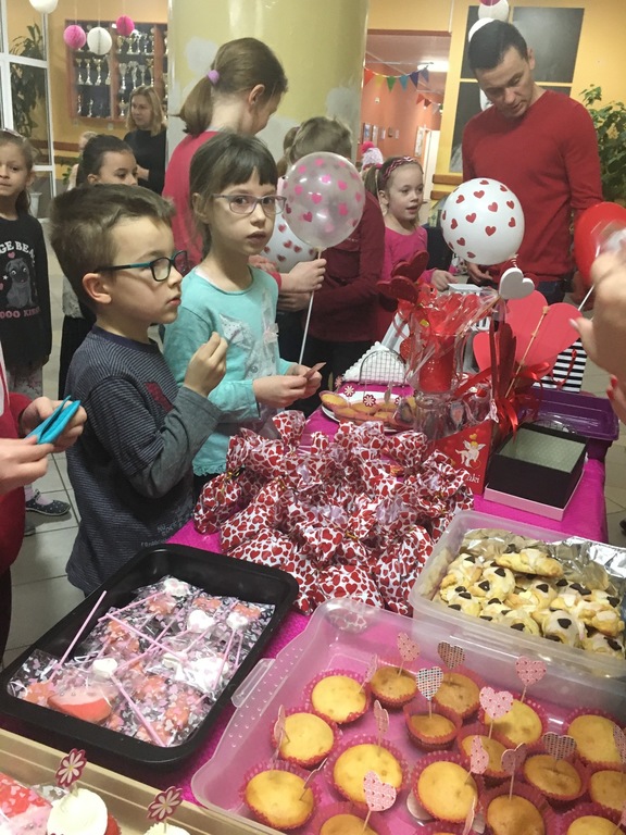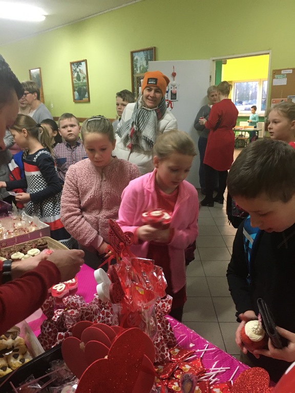 Walentynki pełne były słodkości i niespodzianek. Rodzice klasy 3a i 3b przygotowali kiermasz, na którym mogliśmy nabyć babeczki, ciasteczka, rogaliki i inne smakołyki, udekorowane serduszkowymi motywami. Stoisko było imponujące, a uzyskane dochody ze sprzedaży słodyczy Rada Rodziców przeznaczyła na zakup strojów do tańca, w których uczniowie będą promować szkołę na najbliższych „Drzwiach otwartych” w piątek 21 lutego. Ponadto Samorząd Uczniowski zorganizował pocztę walentynkową, która dostarczała kartki do rąk własnych zakochanym.