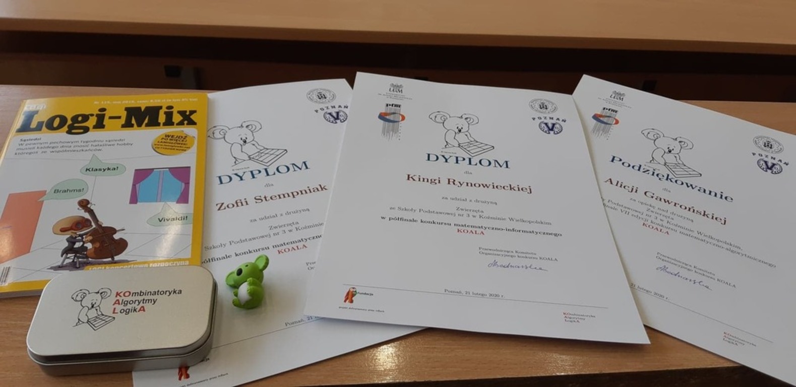 Konkurs KOALA jest organizowany przez Wydział Matematyki i Informatyki UAM, Instytut Informatyki Politechniki Poznańskiej, Odział Poznański Polskiego Towarzystwa Matematycznego oraz V Liceum Ogólnokształcące w Poznaniu. Zmagania konkursowe przebiegają w dwóch kategoriach wiekowych: uczniowie klas 7 i 8 szkół podstawowych Wielkopolski i uczniowie szkół ponadpodstawowych Wielkopolski. Konkurs ma charakter drużynowy. Drużynę tworzy trzech lub czterech uczniów. Z naszej szkoły byli to: Kinga Rynowiecka (kl. VIII b), Zofia Stempniak kl. (VIII b) i Robert Wojtkowiak (kl. VII b), opiekun Alicja Gawrońska. Do konkursu zgłosiło się 118 drużyn z Wielkopolski. Do II etapu konkursu zostało zakwalifikowanych 12 drużyn ze szkół ponadpodstawowych i 8 drużyn ze szkół podstawowych. Jestem dumna z moich uczniów, którzy zaleźli się w gronie zwycięzców I etapu.