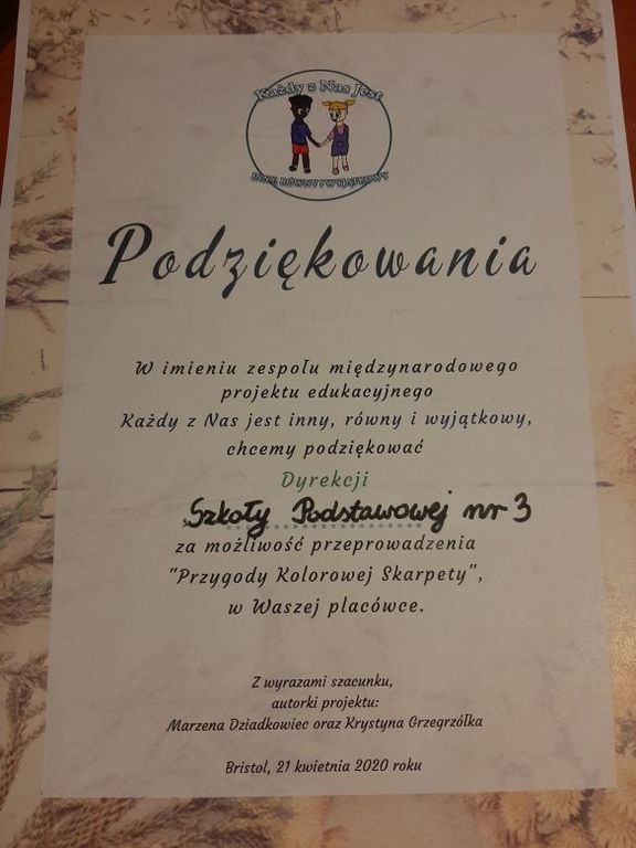 Klasy III a i III b wzięły udział w akcji „Przygoda kolorowej skarpetki” prowadzonej w ramach międzynarodowego projektu edukacyjnego „Każdy