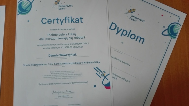 Uczniowie klasy 2 a wraz z wychowawcą Danutą Wawrzyniak w roku szkolnym 2019/2020 realizowali projekt Uniwersytet Dzieci - Technologie z klasą. Jak porozumiewają się roboty? Każdy uczeń uzyskał certyfikat i dyplom. Scenariusze zajęć rozbudzały dziecięcą ciekawość, upowszechniały nowoczesne metody edukacji, wykraczające poza tradycyjne nauczanie oraz ułatwiły realizację zagadnienia bezpieczeństwa w sieci i pomogły rozpocząć przygodę z oprogramowaniem.