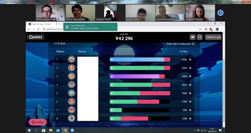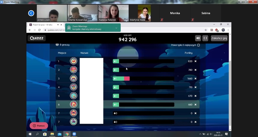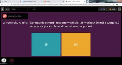 Konkurs został przeprowadzony 21 maja poprzez aplikację Zoom. System wideokonferencyjny umożliwił bezpośredni kontakt wideo między nauczycielami i uczniami. Organizatorzy konkursu, nauczyciele matematyki Alicja Gawrońska i Barbara Łakomiak przygotowali quiz na żywo w aplikacji Quizizz. Wszyscy mieli podgląd w śledzenie postępów uczniów. Rywalizacja była bardzo zacięta, głównie za sprawą uczniów naszej szkoły, jak i Szkoły Podstawowej z Lutogniewa.