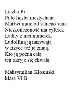 Ponadto uczniowie naszej szkoły przygotowali wiersze i rebusy związane z liczbą Pi. Ciekawe prace przygotowali: Agata Mikołajczyk (kl. IV a), Krystian Grzegorski (kl. IV a), Filip Mikołajczyk (kl. V b) i Maksymilian Kłosiński (kl. VI b). Nagrody zostaną wręczone uczniom w dniu zakończenia roku szkolnego przez wychowawców. Cieszymy się z licznego udziału uczniów w różnych konkursach matematycznych.