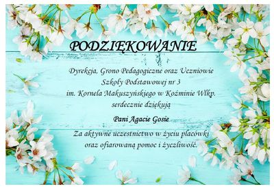Podziękowanie Zdjęcia Zobacz również Wydawanie zaświadczeń OKE Wyniki z egzaminu ósmoklasisty Wyprawka pierwszoklasisty 2020/2021 Podziękowanie UCZCILIŚMY 100. ROCZNICĘ BITWY WARSZAWSKIEJ Komunikat - zmiana terminu zajęć adaptacyjnych 04 sierpnia 2020 Aktualności Wydrukuj Udostępnij Wyświetlono: 227