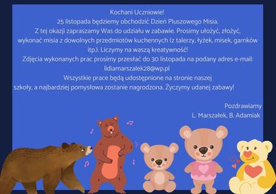 Dzień Pluszowego Misia - Konkurs Zdjęcia Zobacz również KONKURS NA ZDJĘCIE W PRZEBRANIU ROZSTRZYGNIĘTY ŻYCZENIA DLA PRACOWNIKÓW SOCJALNYCH KONKURS MATEMATYCZNY Dzień Pluszowego Misia - Konkurs ZACHĘCAMY DO UDZIAŁU W ŚWIĄTECZNEJ AKCJI Konkurs plastyczny - "Bliżej siebie - jak pomóc... 24 listopada 2020 Aktualności Wydrukuj Udostępnij Wyświetlono: 156