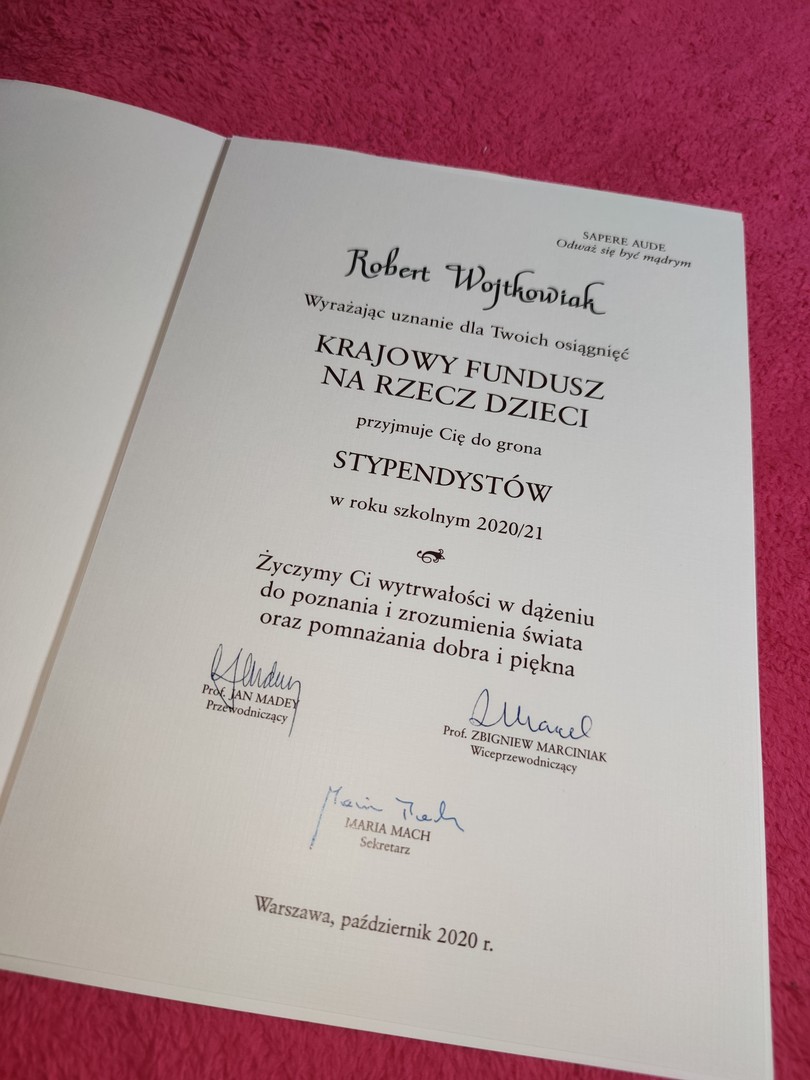 Gratulacje dla ucznia naszej szkoły Roberta Wojtkowiaka - utalentowanego matematyka, który znajduje się wśród stypendystów w roku szkolnym 2020/2021. W gronie stypendystów jest już po raz drugi. Robert uczestniczył w warsztatach i wykładach z dziedziny kombinatoryki, które odbywały się w soboty i niedziele. Jak sam mówi: „ Miałem okazję poszerzyć swoją wiedzę w kierunku matematyczno-informatycznym. Wszystkie warsztaty rozpoczęły się miłym przywitaniem oraz przedstawieniem się, zarówno osób prowadzących, jak i uczestników. Dr Michał Korch poprowadził wykład pt. „Kombinatoryka nieskończona”. Najbardziej pamiętam z tych warsztatów twierdzenie Cantora oraz zbiory. Dr Piotr Chrząstowski-Wachtel przedstawił, czym są rekurencje oraz indukcje, a same zajęcia nazwano „Indukcja i rekurencja”. Dowiedziałem się, czym właściwie jest rekurencja, ponieważ wcześniej nie znałem takiego pojęcia. Natomiast dr Jakub Radoszewski poprowadził zajęcia „Liczby Catalana Zasada włączeń i wyłączeń”. Była to okazja nauczyć się nowych pojęć i wzorów. Zdecydowanie najciekawsze w mojej opinii było przedstawienie wyrażeń nawiasowych.