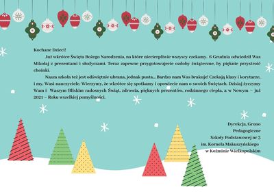 List dla uczniów klas I-III Zdjęcia Zobacz również MUZYCZNA NIESPODZIANKA NA GWIAZDKĘ Gazetka - SZKOLNE WIEŚCI "Trójki" Konkurs „Świąteczne zadania na choince" List dla uczniów klas I-III List dla uczniów klas IV-VIII Komunikat 22 grudnia 2020 Aktualności Wydrukuj Udostępnij Wyświetlono: 203