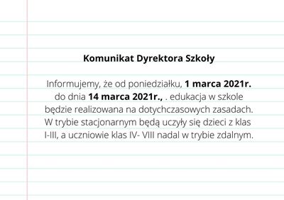 KOMUNIKAT DYREKTORA SZKOŁY Zdjęcia Zobacz również WSPARCIE UDZIELANE PRZEZ PORADNIĘ PSYCHOLOGICZNO-PEDAGOGICZNĄ INFORMACJE REKRUTACYJNE WSPARCIE PSYCHOLOGICZNO–PEDAGOGICZNE DLA UCZNIÓW... KOMUNIKAT DYREKTORA SZKOŁY DZIEŃ PAMIĘCI ŻOŁNIERZY WYKLĘTYCH KOMUNIKAT O PRÓBNYM EGZAMINIE ÓSMOKLASISTY 01 marca 2021 Aktualności Wydrukuj Udostępnij Wyświetlono: 152