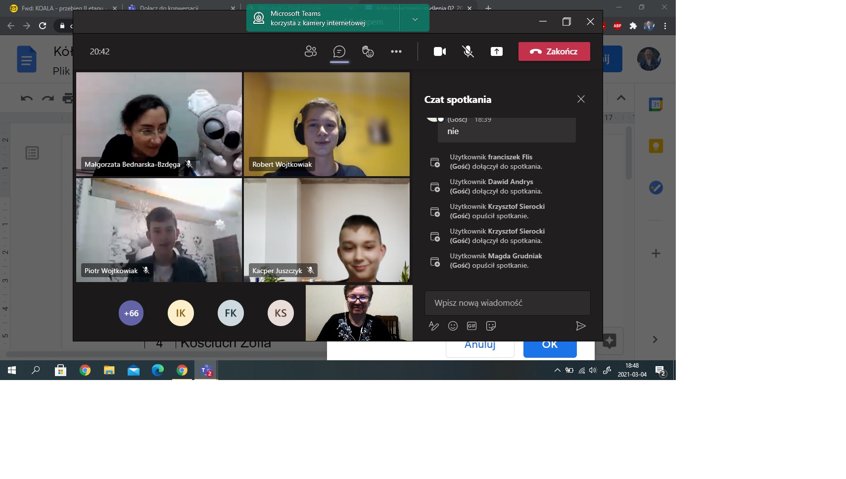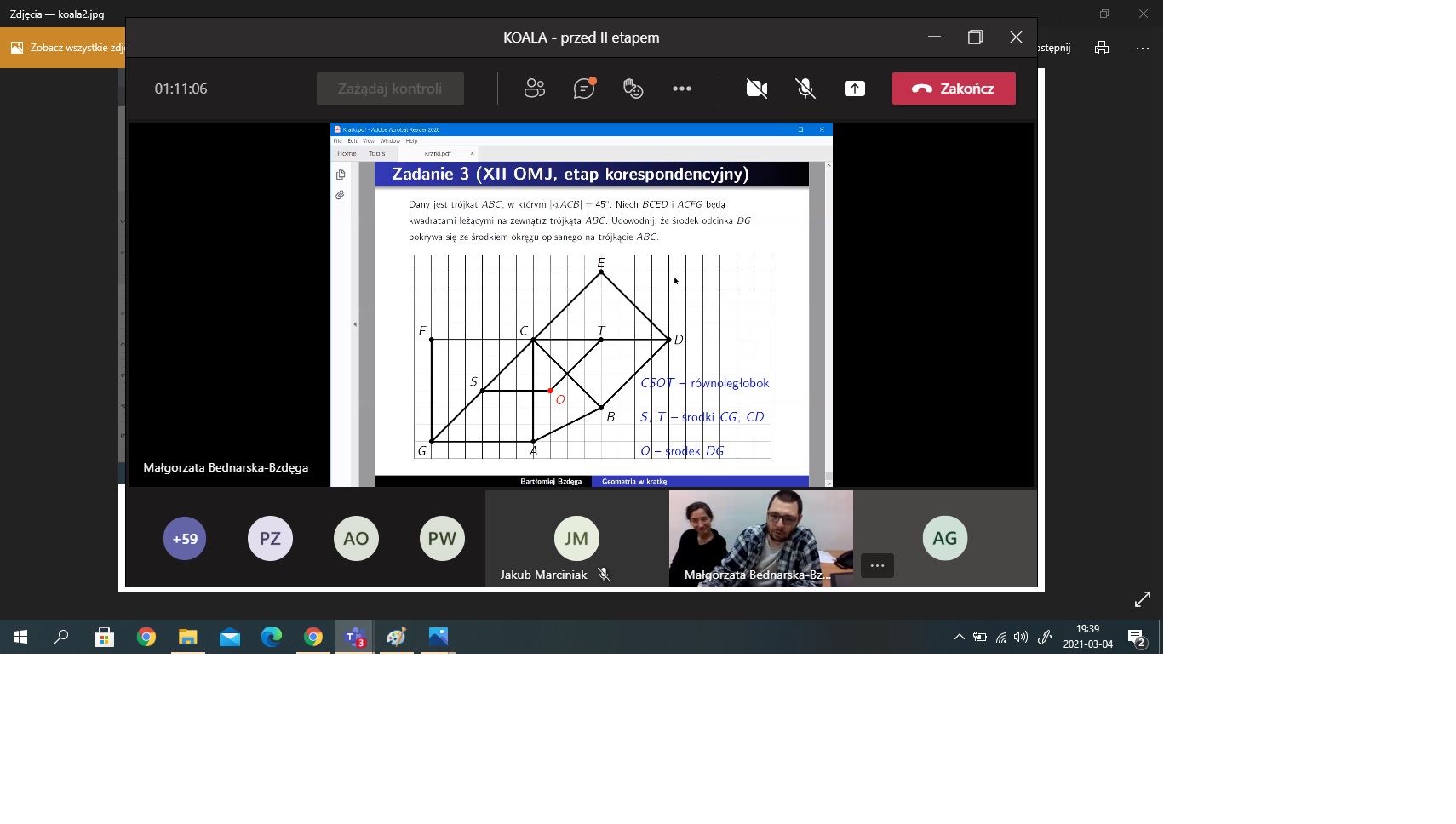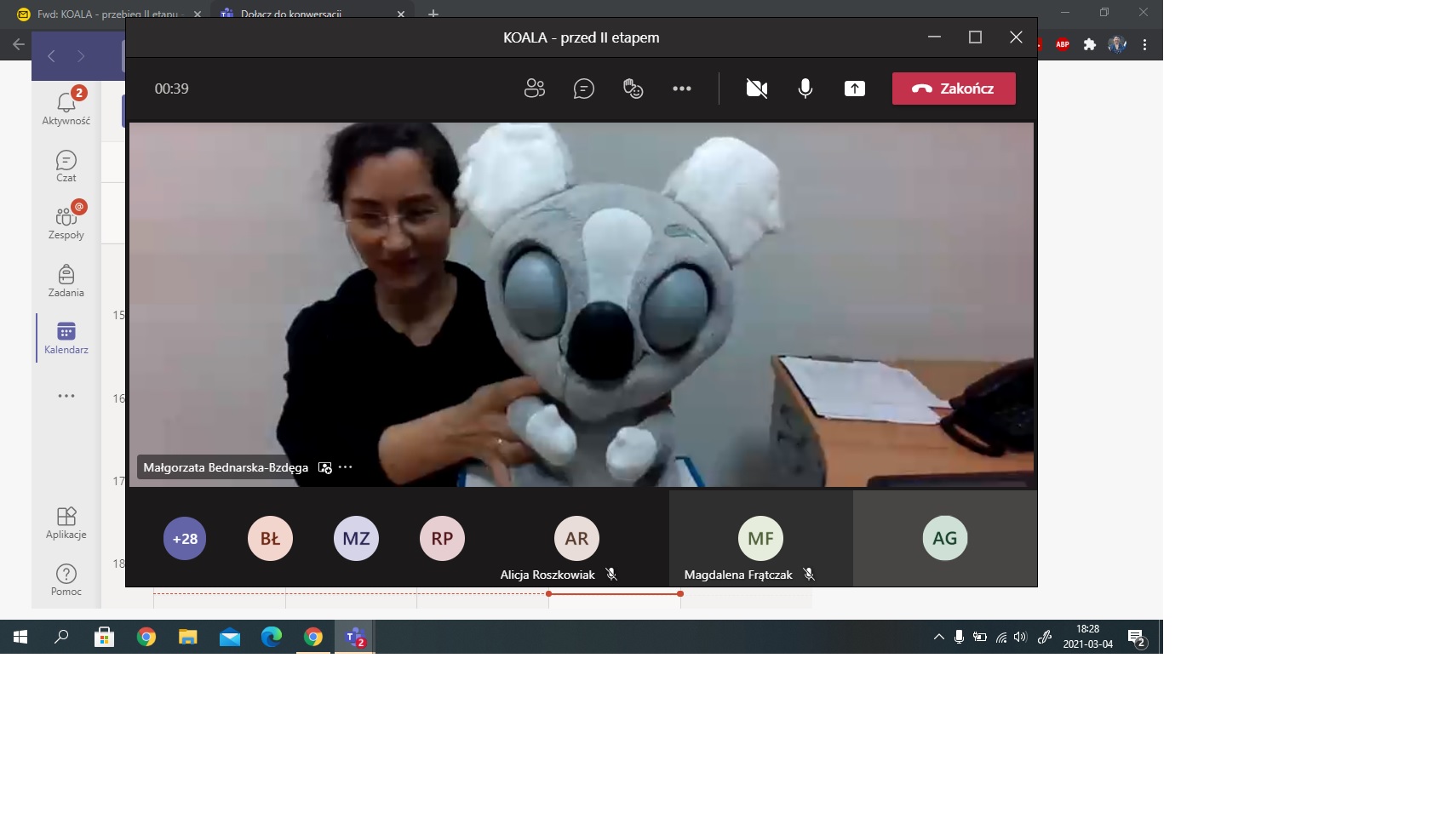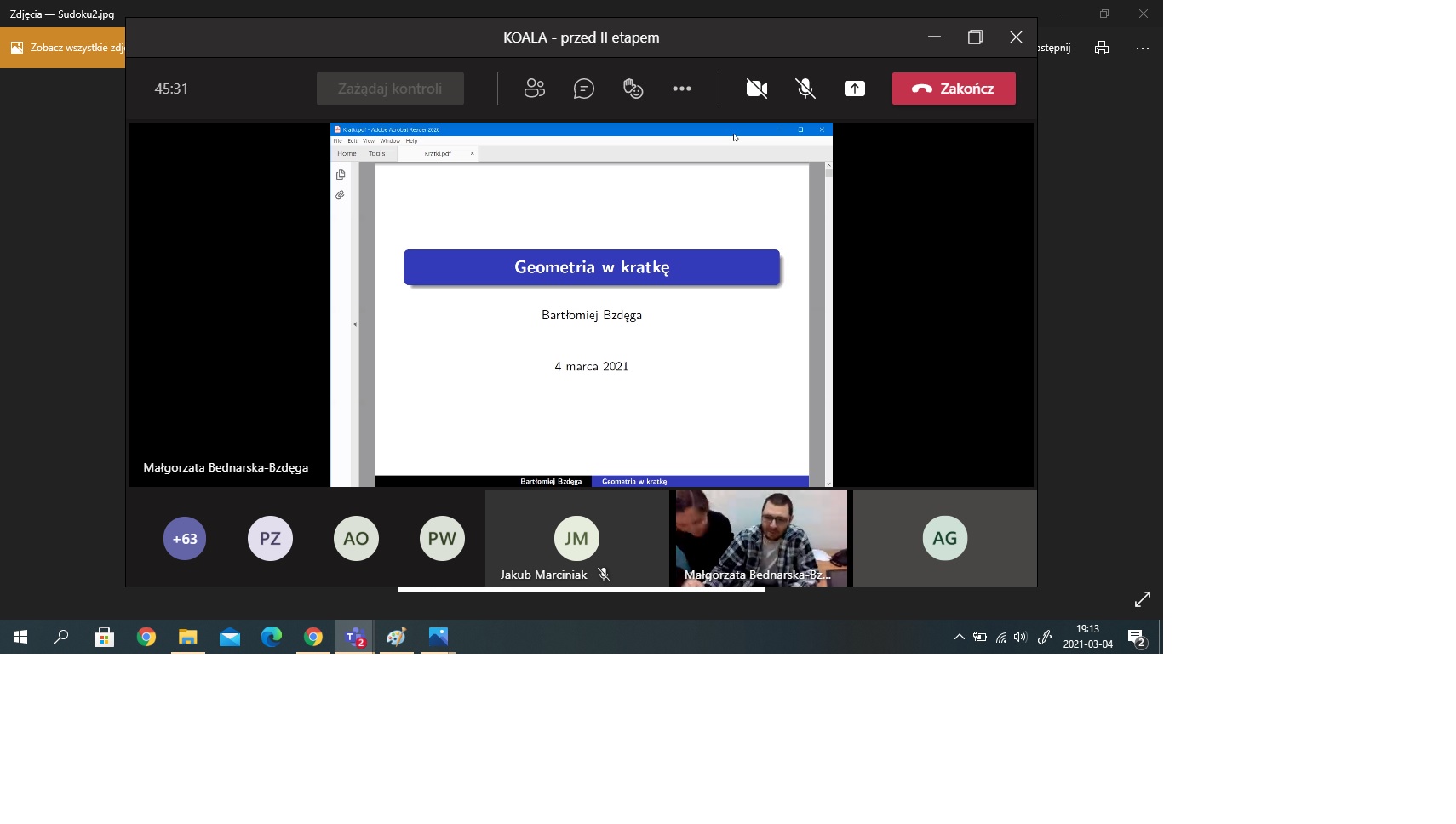 W kategorii szkół podstawowych do półfinałów awansowała m.in. drużyny DrużynaRPK. Drużyny, które zakwalifikowały się do II etapu wielkopolskiego konkursu grup szkolnych KOALA uczestniczyły w czwartek 04 marca w zdalnym wieczorku zapoznawczym. Spotkanie odbyło się na platformie Teams i był prowadzone przez dr hab. Małgorzate Bednarską-Bzdęga. Podczas spotkania kapitanowie przedstawili swoje drużyny oraz opiekuna. Pod koniec odbył się krótki wykład o tym, co ciekawego może wyniknąć z rysowania w kratkach, wygłoszony przez dr Bartłomieja Bzdęgę.