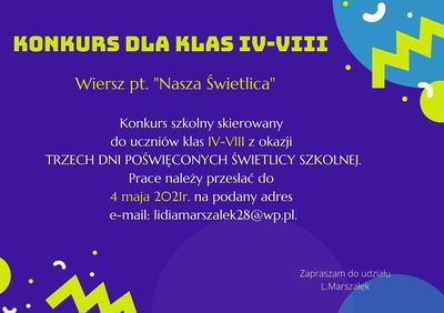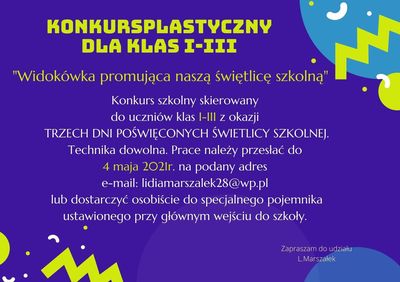 Konkurs dla klas I-III i IV-VIII Plakaty konkursowe poniżej w załączniku. Zdjęcia Zobacz również UDZIAŁ W PROJEKCIE Nauczanie zdalne w klasach I-VIII Spotkanie z Rodzicami Konkurs dla klas I-III i IV-VIII DZIECI - UCZĄ RODZICÓW - PROJEKT Przedstawienie "Tropiciele" 19 kwietnia 2021 Aktualności Wydrukuj Udostępnij Wyświetlono: 165