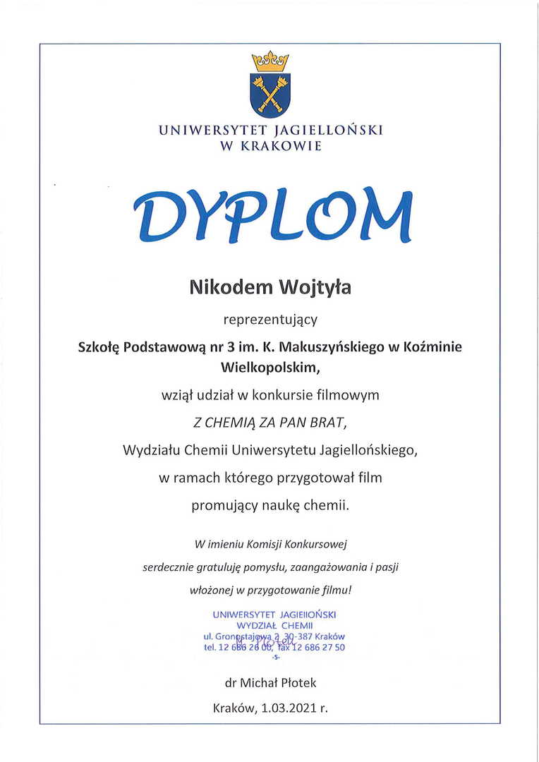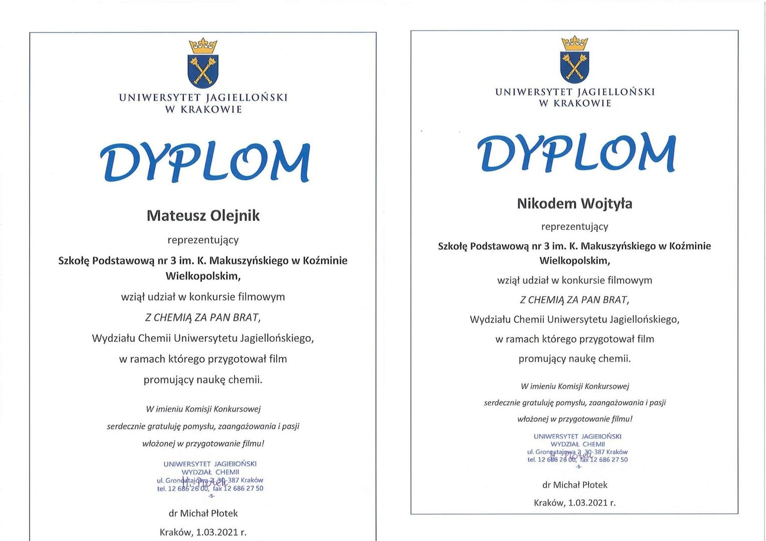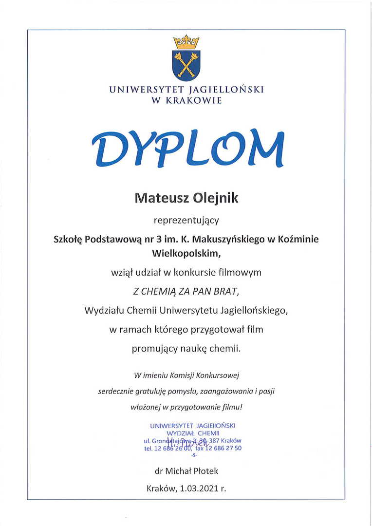 Uczniowie naszej szkoły brali udział w ogólnopolskim konkursie Z CHEMIĄ ZA PAN BRAT zorganizowanym przez Wydział Chemii Uniwersytetu Jagiellońskiego. Mateusz O., Nikodem W. przygotowali ciekawy film zachęcający do poznawania chemii. Uczestnikom serdecznie gratulujemy!