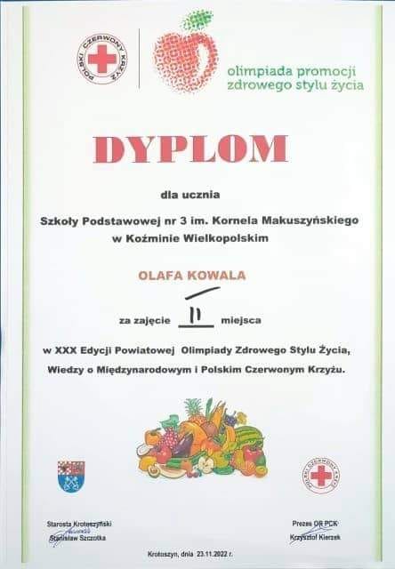 W środę tj. 23.11.2022 roku uczeń naszej szkoły Olaf Kowal zajął drugie miejsce w Olimpiadzie Wiedzy o Zdrowiu PCK. Chłopiec reprezentował szkołę w etapie rejonowym po wygraniu etapu szkolnego. Uczestnicy olimpiady musieli wykazać się wiedzą dotyczącą prawidłowego odżywiania, ekologii oraz zasad zdrowego stylu życia.