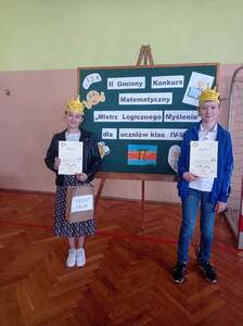 Dnia 26 maja 2023 r. w Szkole Podstawowej nr 1 im.Strajku Dzieci Koźmińskich 1906/1907 w Koźminie Wielkopolskim odbył się II Gminny Konkurs Matematyczny " Mistrz Logicznego Myślenia" dla uczniów klas IV - VI Szkół Podstawowych. Mistrzem Logicznego Myślenia klas IV został Jakub Sobczyk uczeń Szkoły Podstawowej nr 1 w Koźminie Wielkopolskim. W kategorii klas V mistrzem został uczeń naszej szkoły Tobiasz Pieniężny (klasa V a), w kategorii klas VI mistrzem została również uczennica naszej szkoły Blanka Kuzia (klasa VI b). Wszystkim uczestnikom konkursu gratulujemy i życzymy dalszych sukcesów w nauce.