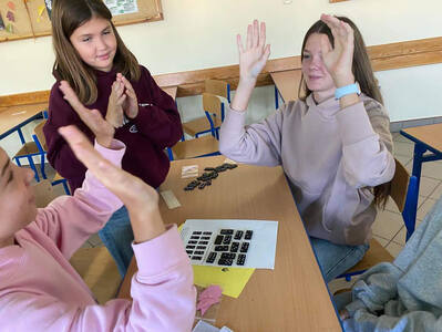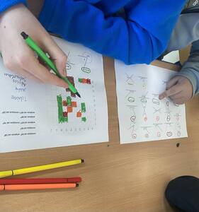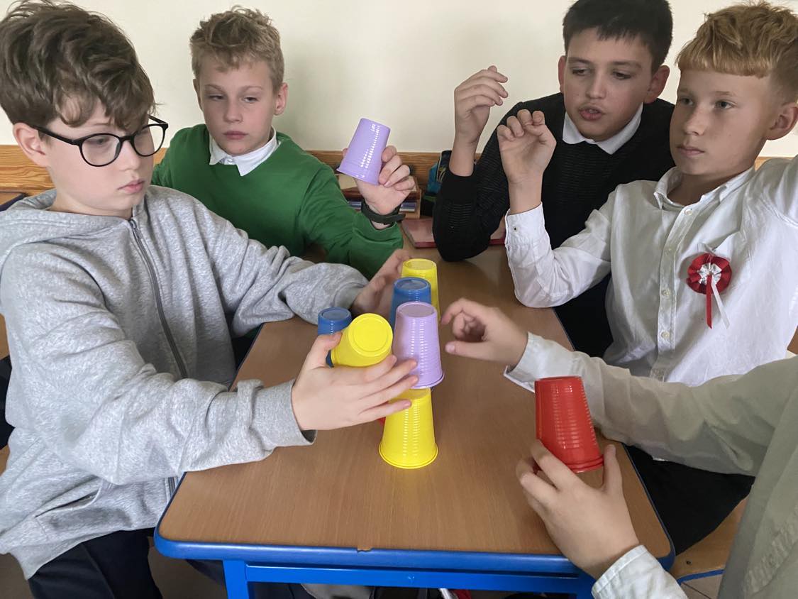 Kodują m. in. przy pomocy kolorowych kubków. Zadaniem uczniów było rozwiązanie zadań związanych z własnościami liczb naturalnych, a następnie zbudowanie odpowiedniej piramidy. Kolor kubka określał odpowiedni kod. Zadania zostały zaczerpnięte z książki Joanny Świercz „Matma inaczej. Kodowanie”.