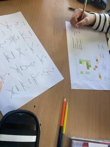 Uczniowie powtarzali materiał dotyczący kątów wierzchołkowych i przyległych. Po zapisaniu miar kątów musieli sprawdzić jakiego koloru mieli użyć do pomalowania kratownicy. Powstały jesienne drzewa. Wykorzystano kartę pracy ze strony Joanny Świercz www.matmainaczej.pl.