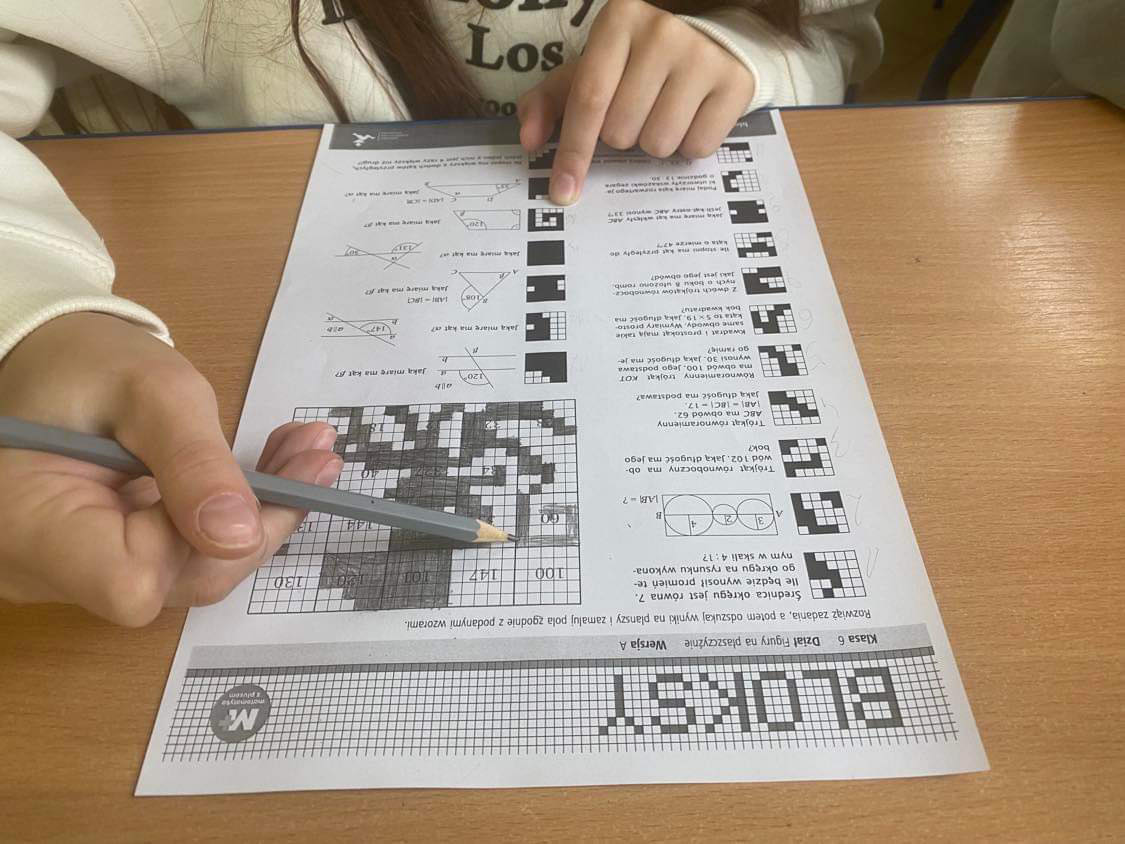 Ciekawym sposobem pracy dla uczniów okazały się Bloksy pochodzące ze strony www.gwo.pl. Uczniowie musieli rozwiązać zadania dotyczące figur geometrycznych na płaszczyźnie. Następnie musieli znaleźć wynik na przygotowanej planszy i zamalować pola zgodnie z podanym wzorem. Powstała piękna ośmiornica.