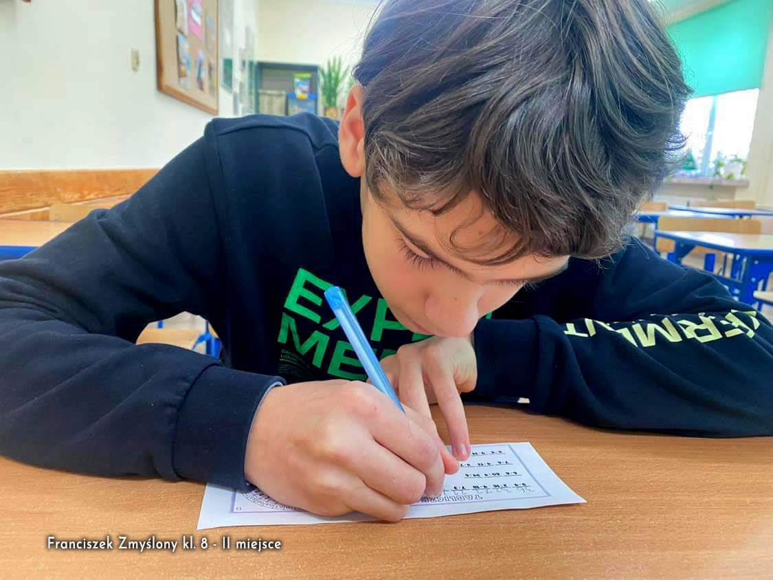 kl. VIII – I miejsce Franciszek Zmyślony, II miejsce Natalia Lukianenko, Alan Moskalik.
