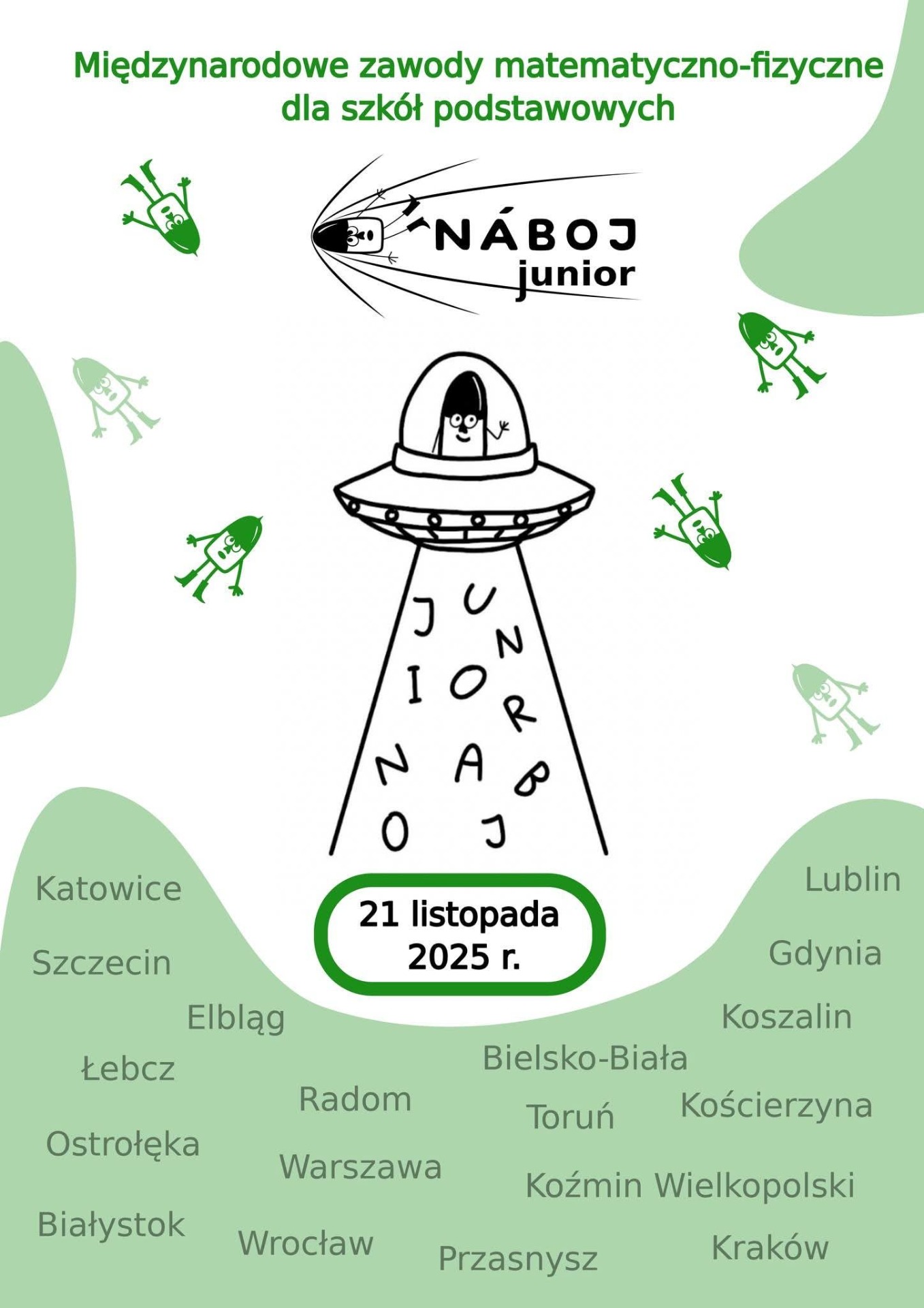 Naboj Junior to zawody matematyczno-fizyczne dla czteroosobowych drużyn. W tym roku zawody rozgrywane są 21.11.2025 od 10:00 do 12:00. Udział w zawodach jest darmowy.