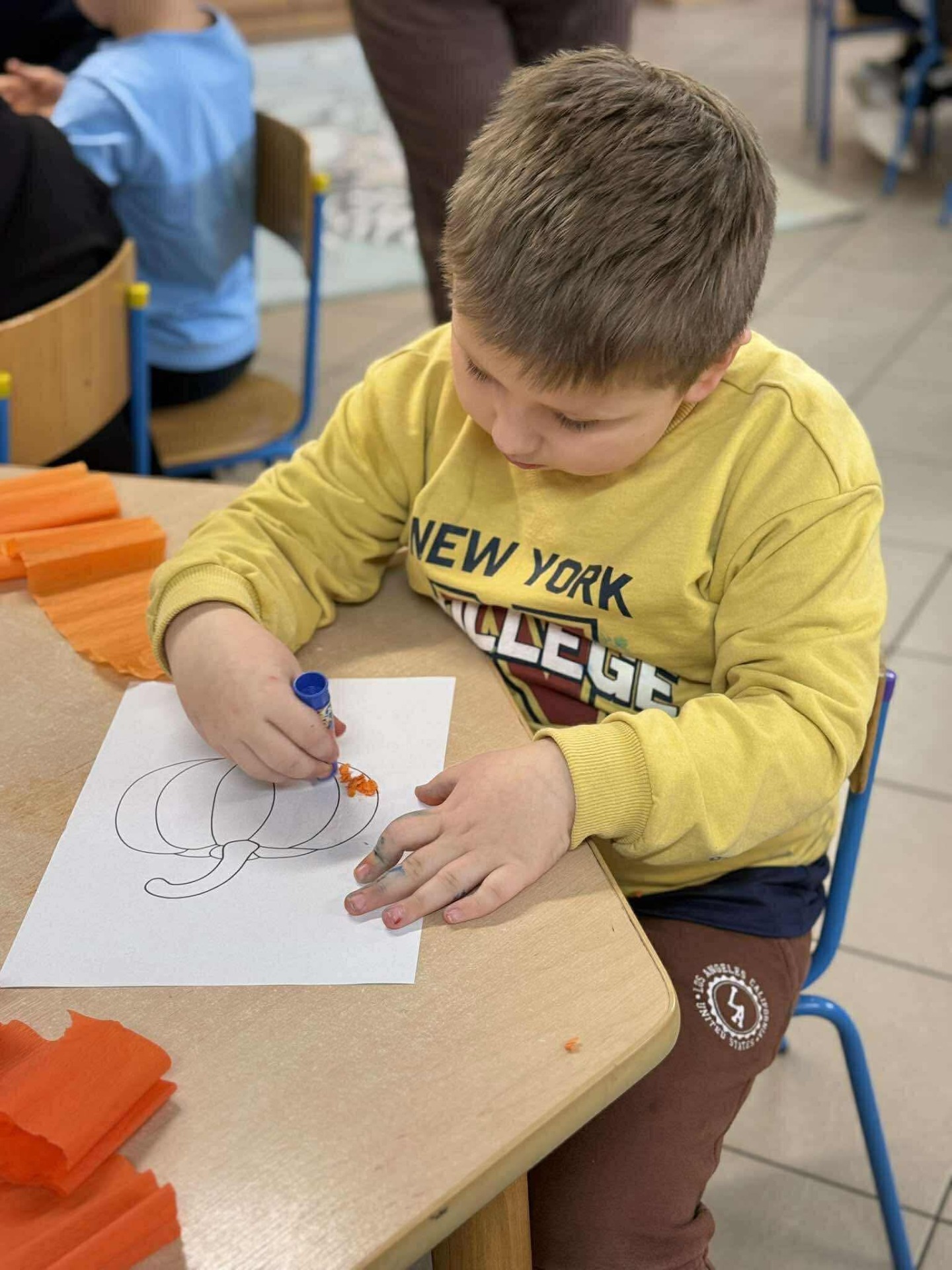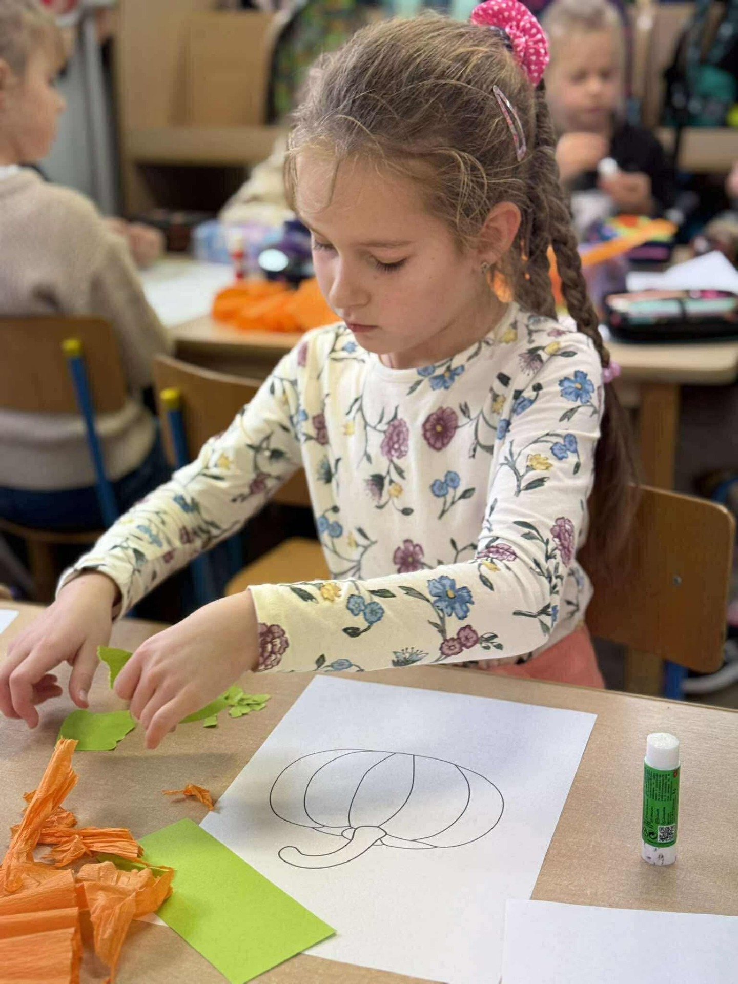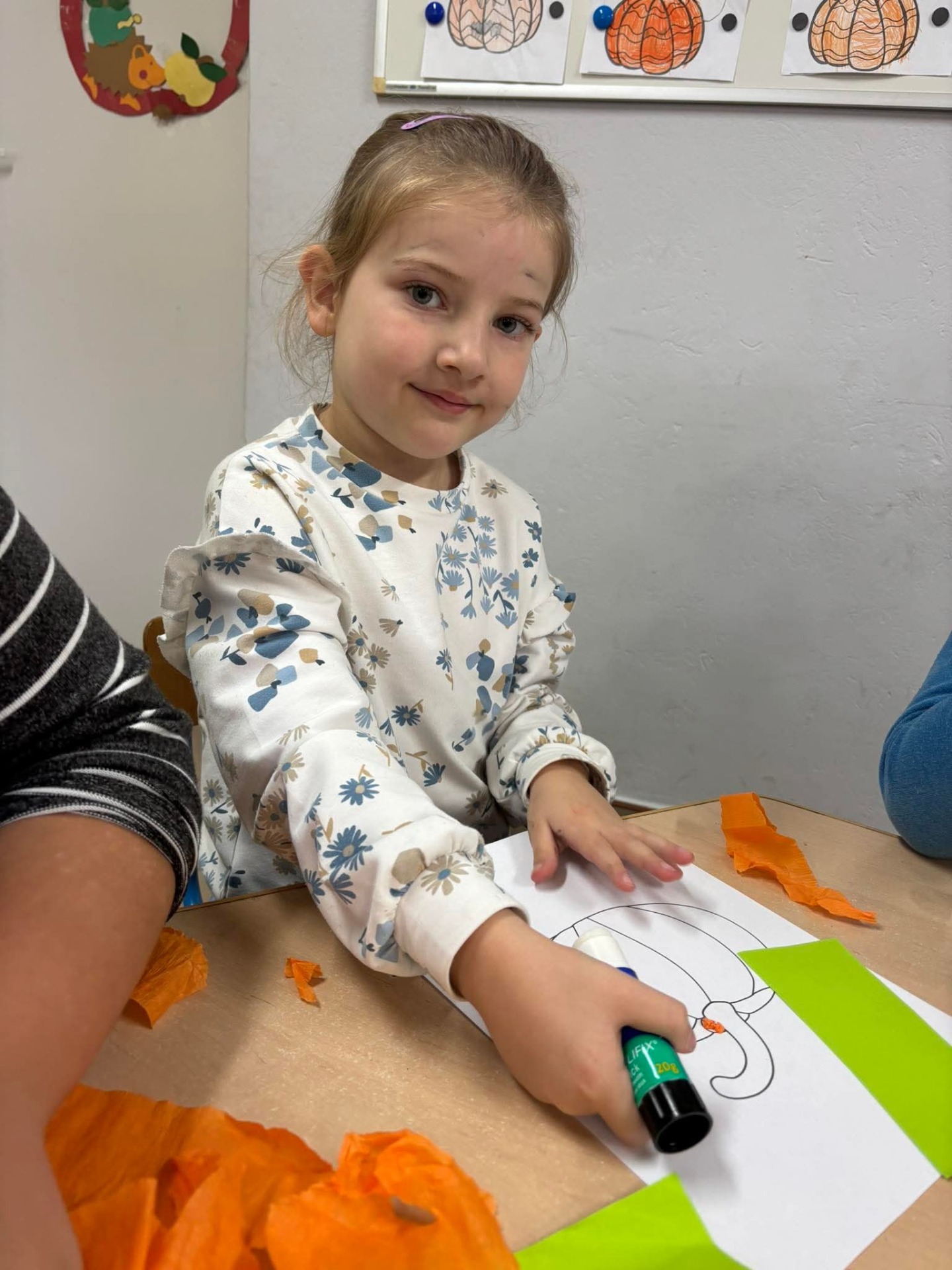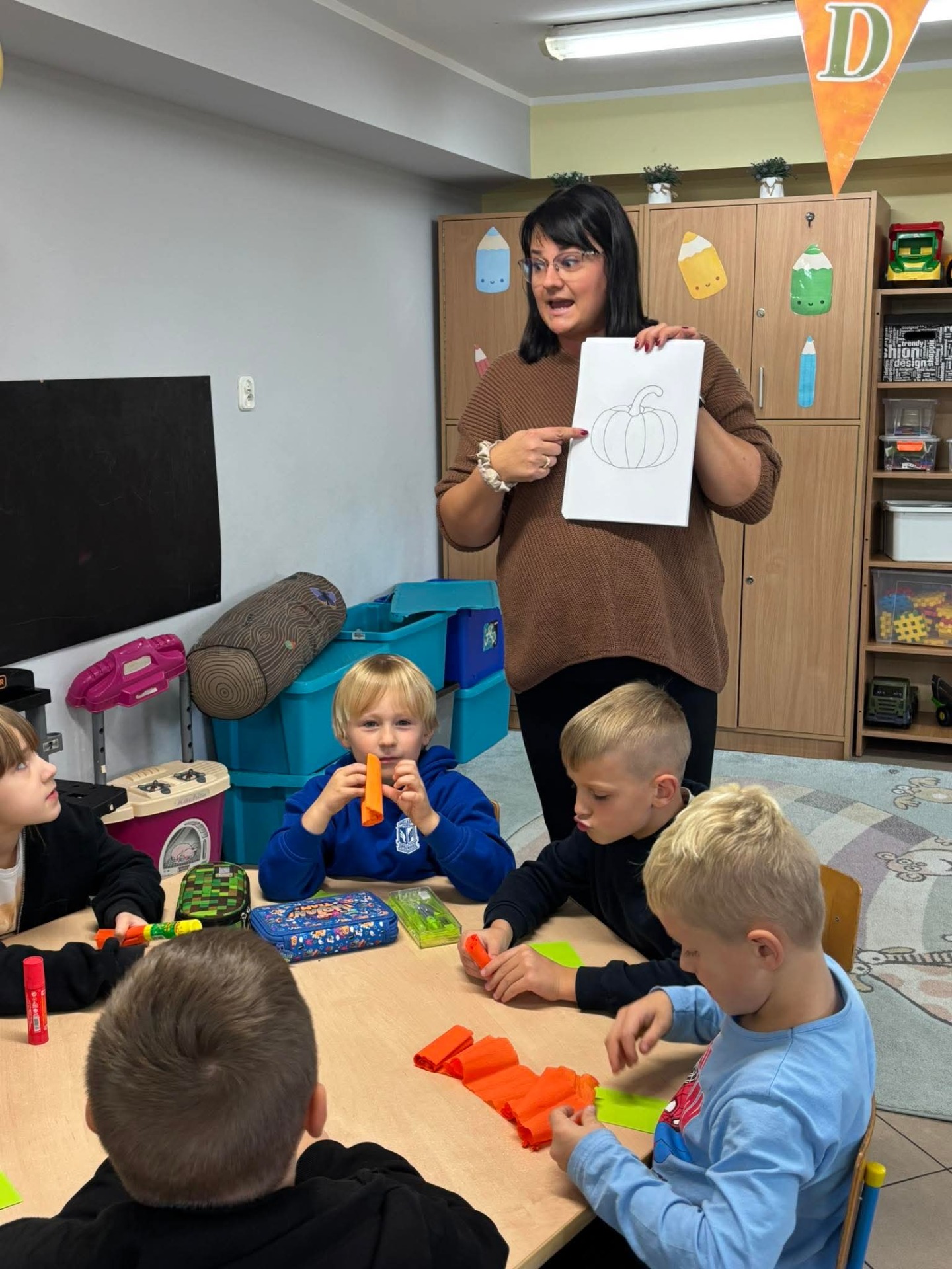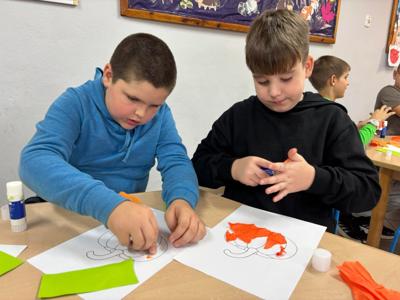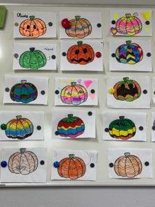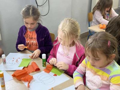 Nie zabrakło też twórczej zabawy – dzieci wykonały „kreatywne dynie” z papieru, bibuły i materiałów plastycznych. Powstały kolorowe, pomysłowe prace, które ozdobiły naszą świetlicową wystawę. 🎨🎃