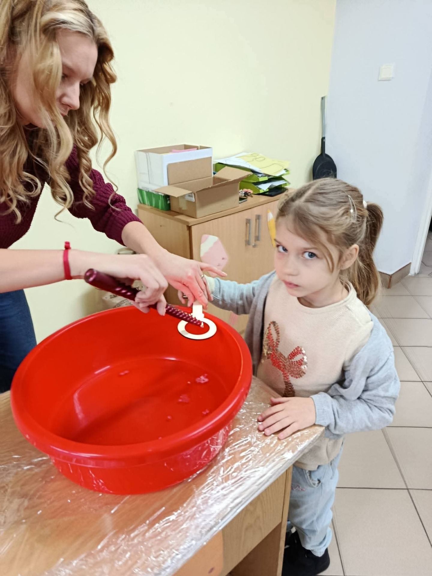 Pierwszym punktem programu była kreatywna praca plastyczna. Dzieci tworzyły kolorowe ilustracje eliksirów, a następnie wspólnie zastanawialiśmy się, jakie wyjątkowe moce mogłyby one mieć. Pomysłom nie było końca – od eliksiru odwagi, przez eliksir śmiechu, aż po eliksir spełniający marzenia.