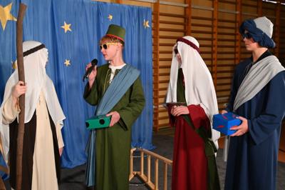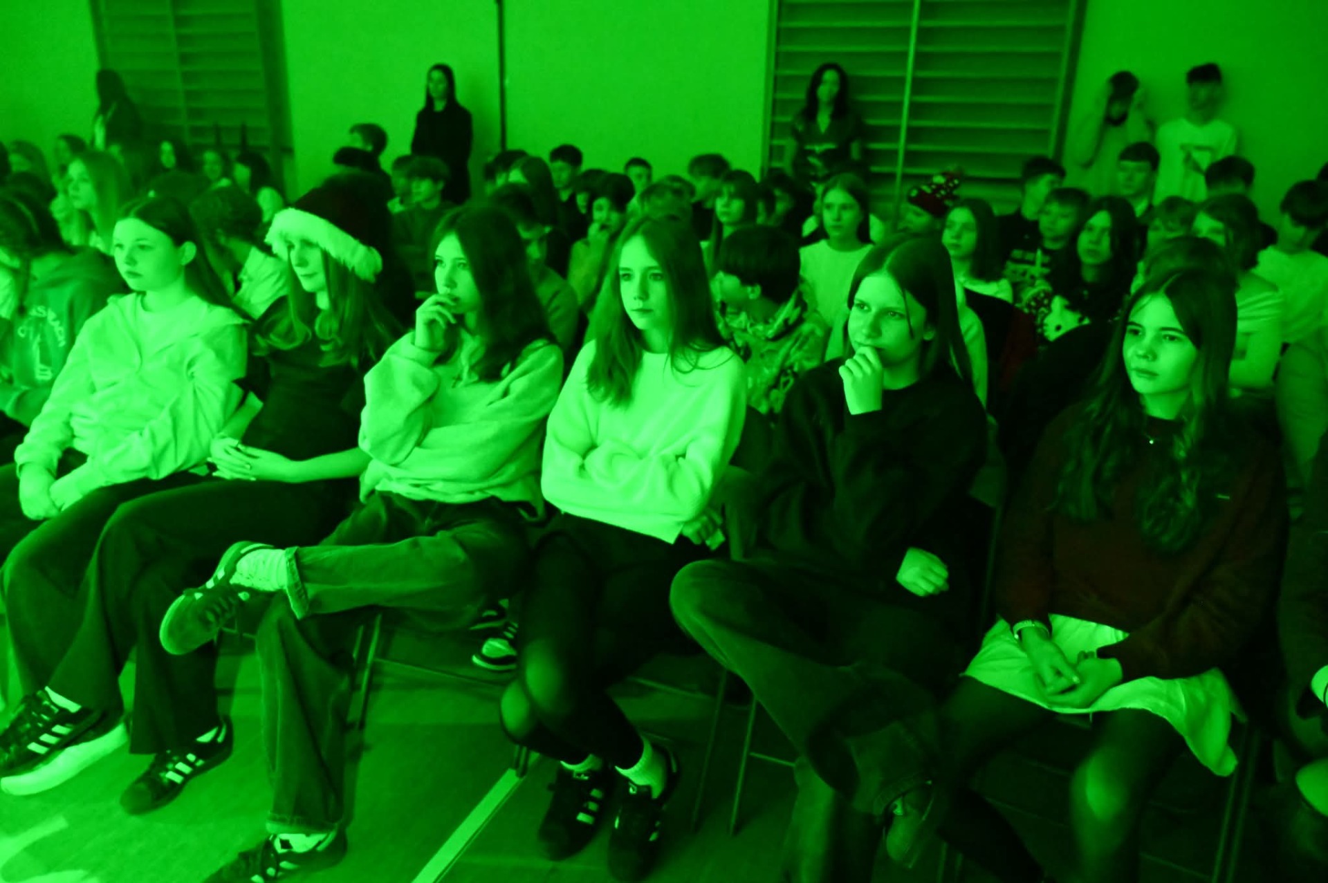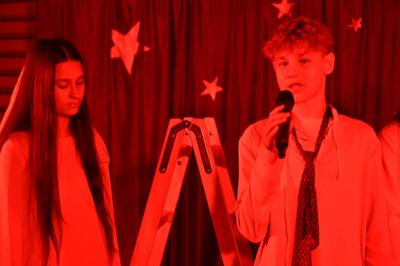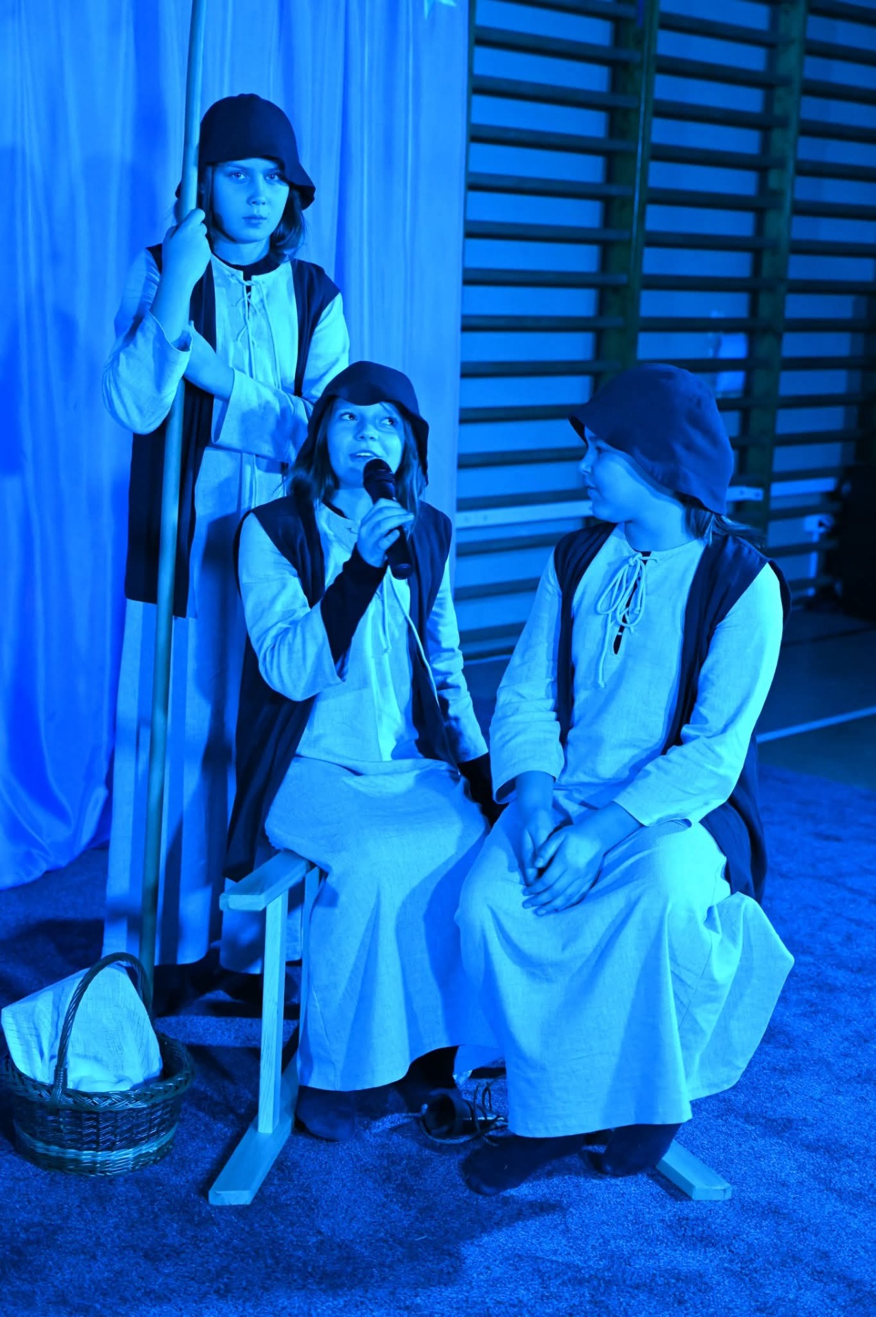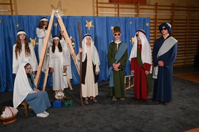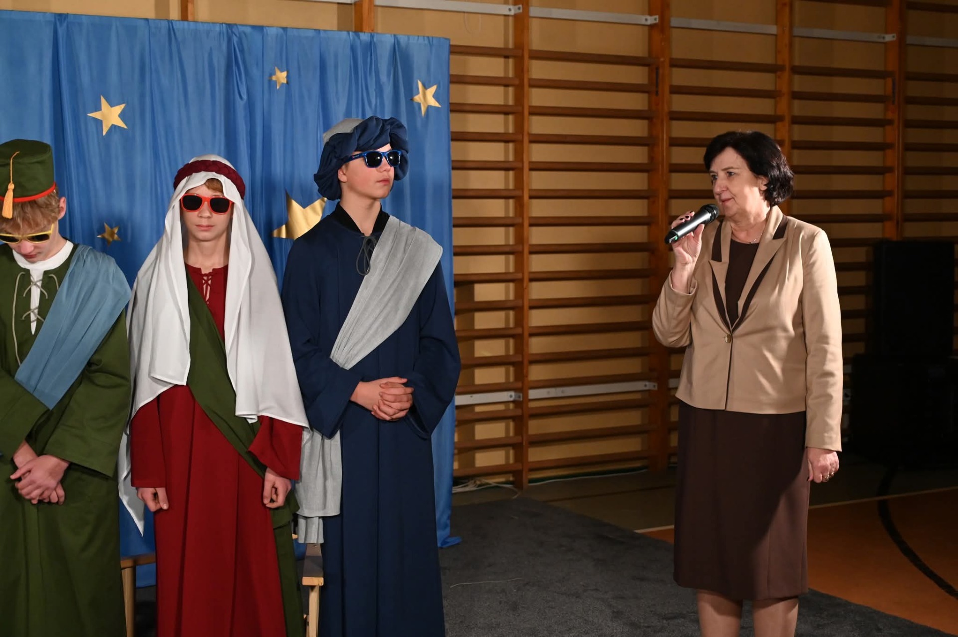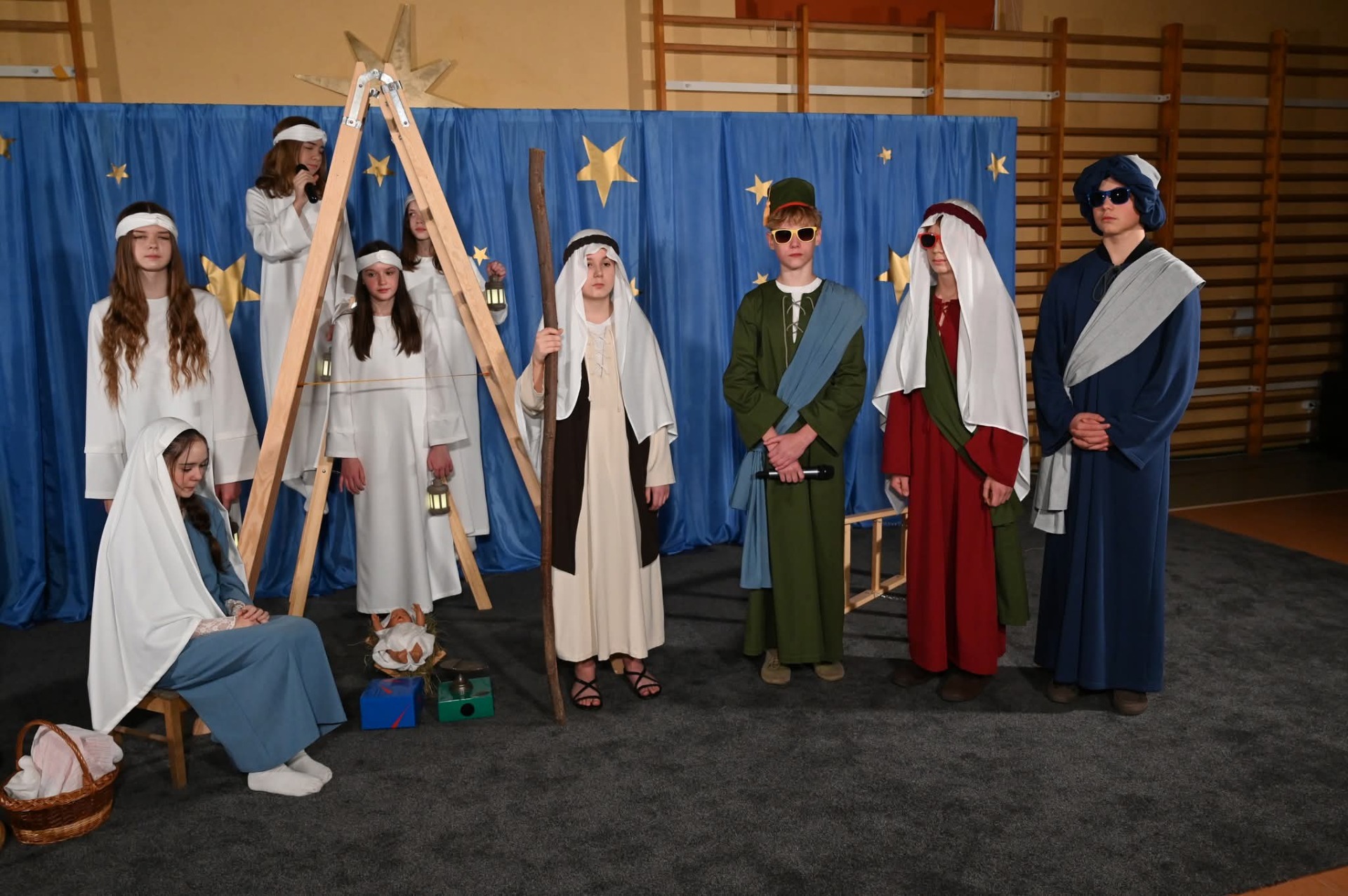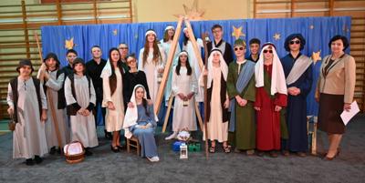 Świąteczny nastrój w naszej szkole odczuwalny był od kilku dni. Zwieńczeniem tych dni były dziś klasowe spotkania wigilijne. Podniosłość tego dnia podkreśliło widowisko jasełkowe w wykonaniu naszej Grupy Teatralnej 10.50. Jak na bożonarodzeniowe dni przystało było w tym przedstawieniu wiele kolorów, śpiew kolęd, gra świateł, fakt betlejemskiego wydarzenia i podkreślenie odwiecznej prawdy zwycięstwa światła nad ciemnością i dobra nad złem. To wszystko udało się aktorom, którzy jak przystało na te święta oczarowali szkolną publiczność swoją grą i strojami. GT 10.50 wraz z panem Robertem Idkowiakiem znów wszystkich zadziwiła.
