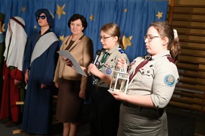 Po spektaklu harcerze przekazali Światełko Betlejemskie pani dyrektor Arlecie Szkudlarek, by światło mogło zabłysnąć w naszych domach.